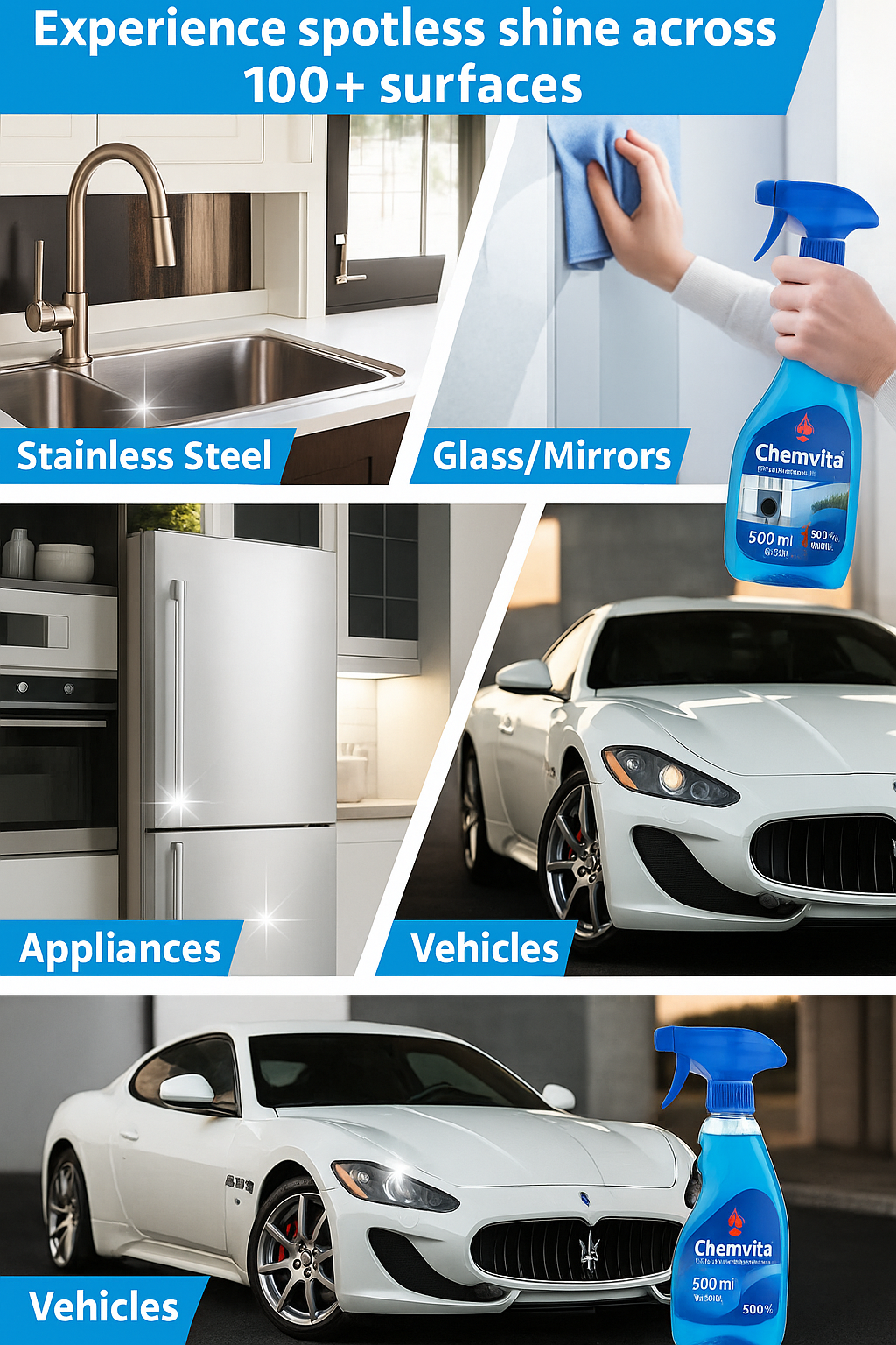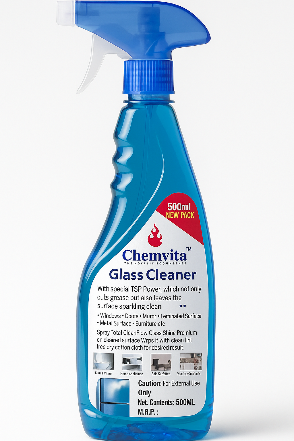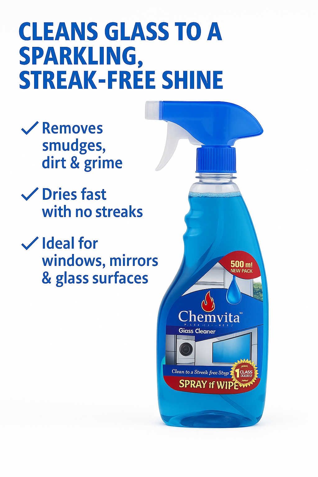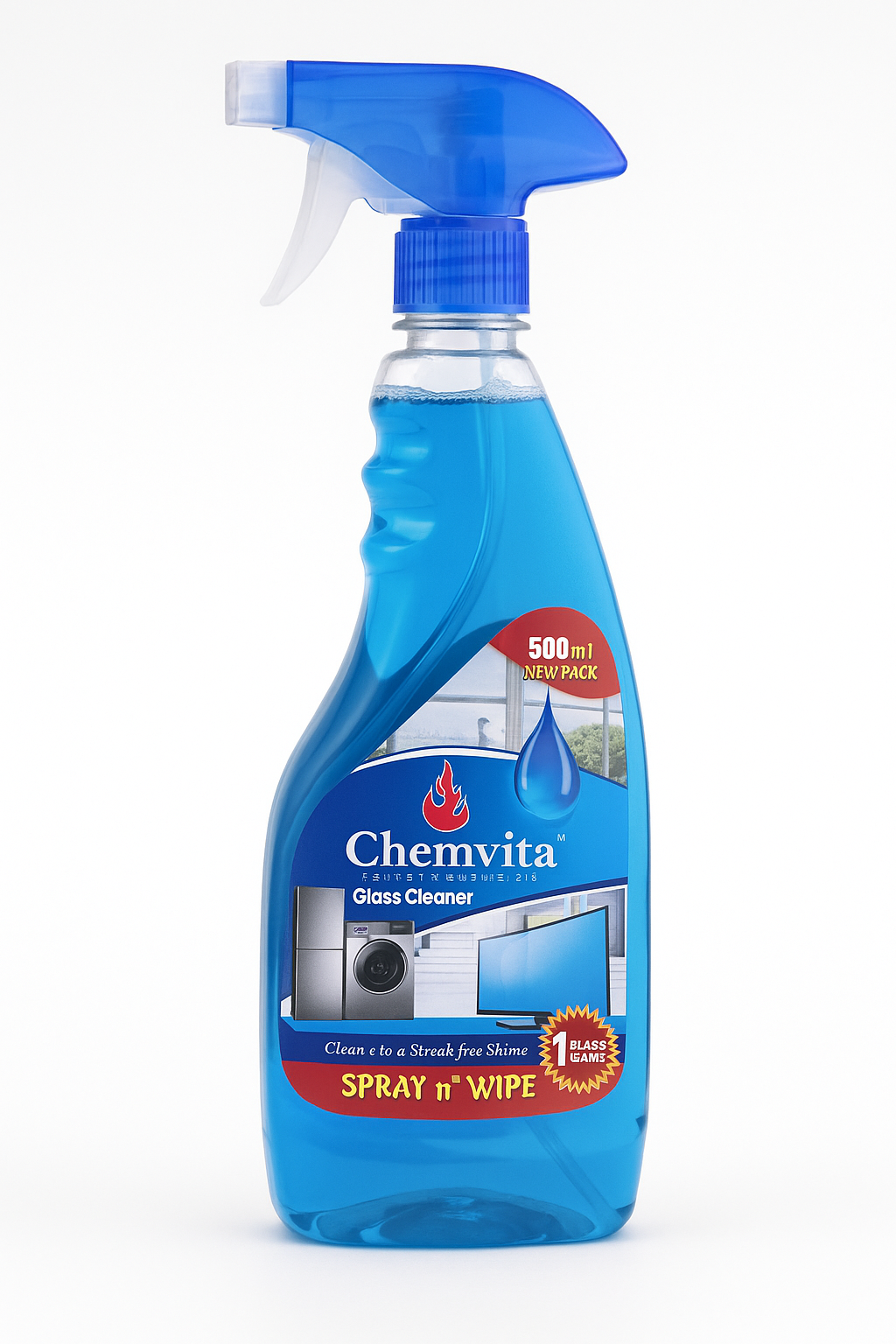 Bring sparkle back to your glass surfaces with Chemvita Glass Cleaner. Formulated with a powerful streak-free formula, it removes dust, dirt, watermarks, and greasy fingerprints effortlessly. Suitable for windows, mirrors, glass tables, car windshields, and other shiny surfaces, Chemvita Glass Cleaner gives a crystal-clear finish with a refreshing fragrance. Its quick-drying technology ensures no streaks or residue, leaving surfaces spotless and gleaming.
